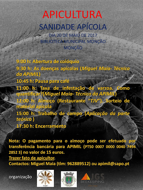 Vai a APIMIL organizar um seminário sobre sanidade apícola e biologia da abelha no dia 3 de junho pelas 9h00 na casa da cultura de Ponte da Barca (entre a Câmara Municipal e as bombas da GALP). Da parte da tarde é parte prática no apiário.